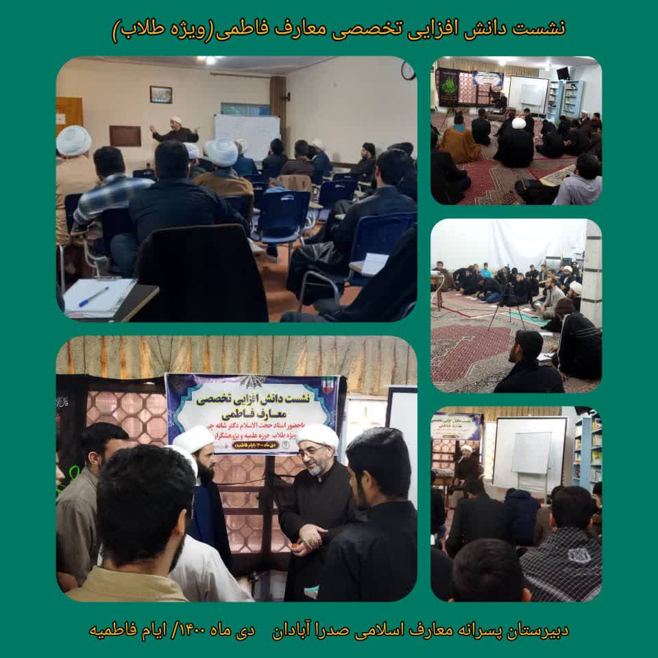 به مناسبت ایام فاطمیه و ضرورت آشنایی هر چه بیشتر افراد تاثیر گذار در جامعه، دبیرستان پسرانه معارف اسلامی صدرای آبادان، روزهای اول و دوم دی ماه ۱۴۰۰، یک دوره نشست دانش افزایی تخصصی پیرامون معارف فاطمی ویژه فرهنگیان و طلاب شهرهای آبادان و خرمشهر برگزار کرد. این دوره توسط استاد محترم و متخصص مباحث امامت و ولایت جناب حجت الاسلام دکتر شانه تدرس شد. در پایان این دوره بسته های فرهنگی به شرکت کنندگان اهدا گردید.